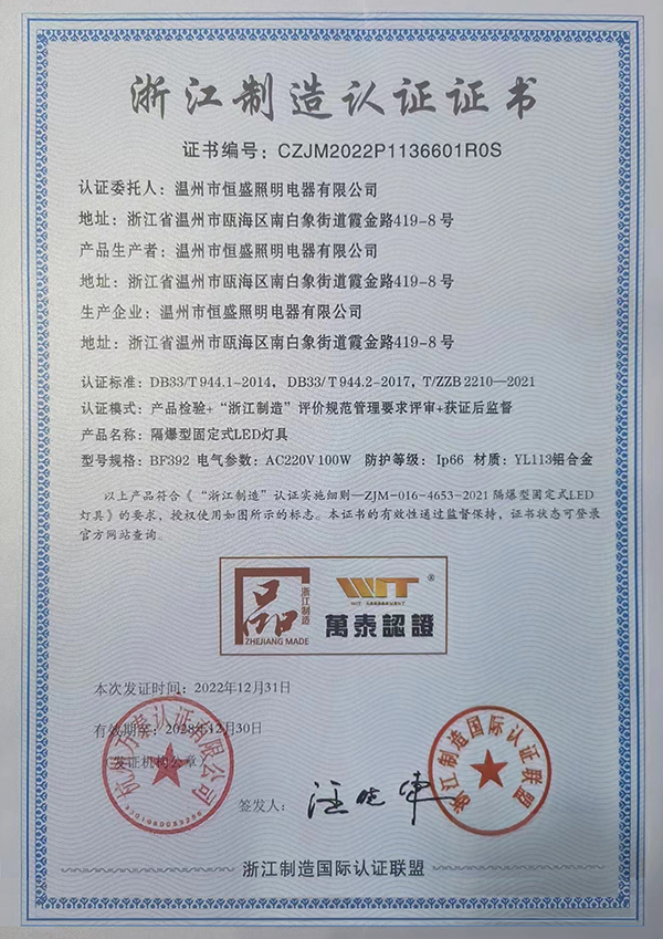 2022年12月 ,溫州市恒盛照明電器有限公司順利通過了產(chǎn)品檢驗(yàn)與“浙江制造” 評(píng)價(jià)規(guī)范管理要求評(píng)審 ,獲得《浙江制造認(rèn)證證書》 !我司將會(huì)繼續(xù)不斷創(chuàng)新 ,開拓進(jìn)取 ,努力將更優(yōu)質(zhì)的產(chǎn)品輸送給市場 ,感謝新老客戶一直的信賴與支持。