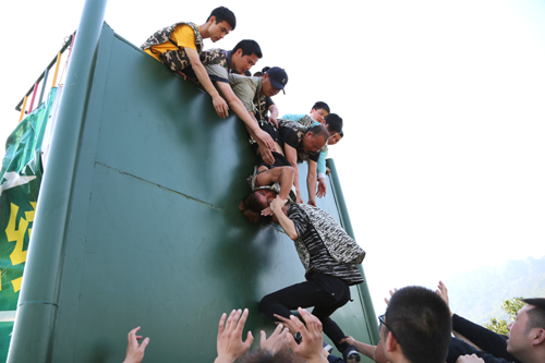 后面就是洪水猛獸,后面就是烈火洶洶,危險40分鐘后就要降臨。團隊50多人必須在這個時間內翻越一堵高四米,光滑沒有任何依附物的墻。我們也沒有繩索,沒有支撐物,沒有救兵。只有雙手與雙臂,只有我們勇于承擔的肩膀,只有用我們的智慧,只有用我們的默契配合才能翻越障礙,獲得自由。這就是“跨越2017”設置的場景。